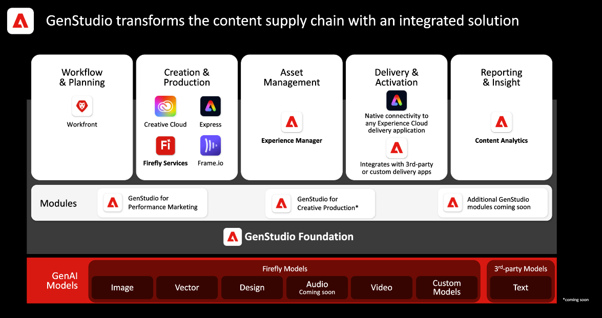 Adobe showcased GenStudio for Performance Marketing, an AI-first application that enables marketers to create on-brand content connected to campaigns with guardrails. Adobe is positioning GenStudio as the foundation for all stages of the content supply chain with Firefly models underneath.