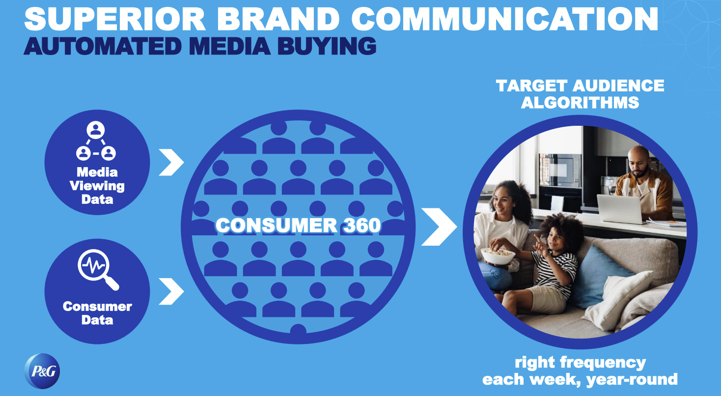 Use AI to make the marketing and advertising spend more efficient. Jejurikar said the company is using programmatic and algorithm-based media buying to find consumers most likely to be receptive to messaging. "Our proprietary Consumer 360 data platform enables brand to use target audience algorithms to serve ads at the right frequency each week, all year round, more effective reach and more cost efficient," he said. P&G's media reach in the US has grown to 80% from 64% over five years. Reach in Europe is now 75%.