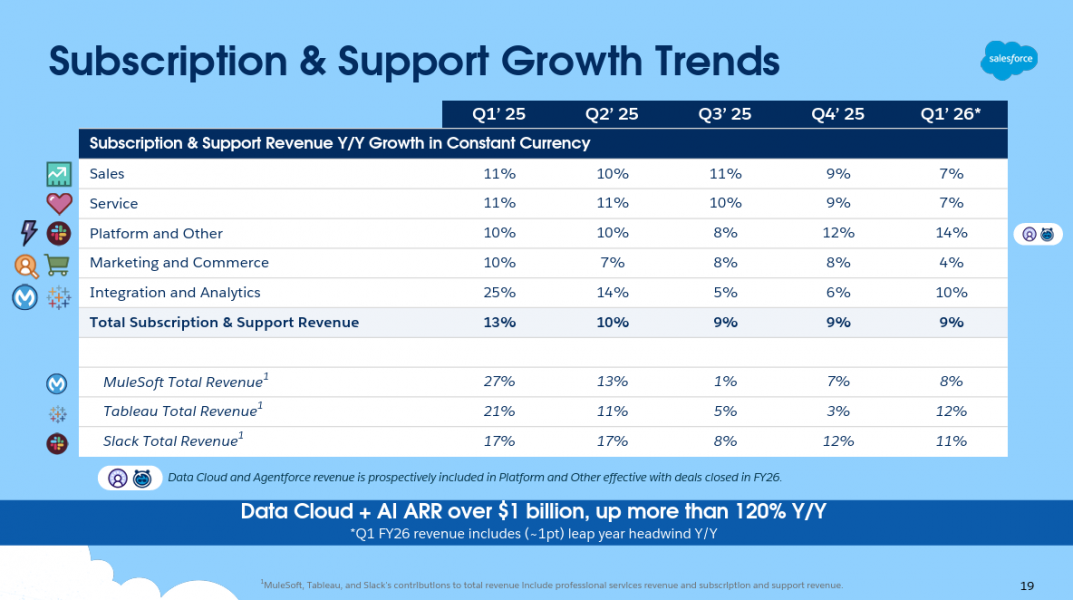 As for the outlook, Salesforce said it would see a currency tailwind due to a weaker US dollar. The company projected second quarter revenue of $10.11 billion to $10.16 billion, up 8% to 9%. Non-GAAP earnings in the second quarter will be between $2.76 a share to $2.78 a share. In constant currency, growth would be 7% to 8%. Salesforce projected fiscal 2026 revenue of $41 billion to $41.3 billion, up 8% to 9%. Non-GAAP earnings for fiscal 2026 are projected to be $11.27 a share to $11.33 a share.
