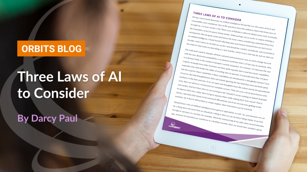 During a recent panel discussion on artificial intelligence (AI) and the law, the issues of trust and responsibility were considered. One of the questions from the audience asked what three laws of AI might be, a la Isaac Asimov’s The Three Laws of Robotics within his Robot series (and, eventually, the Foundation series) of science fiction books. While perhaps not as earth- or empire-shaking as envisioned by the late great writer (and hence the lower cases), considering a potential three laws of artificial intelligence, I found myself reflecting upon past lessons learned from our last several decades. And it seems to me that we can be—and should be—careful, considerate, and successful in the midst of what some are describing as a new frontier, which it very well may be, but we shall see.