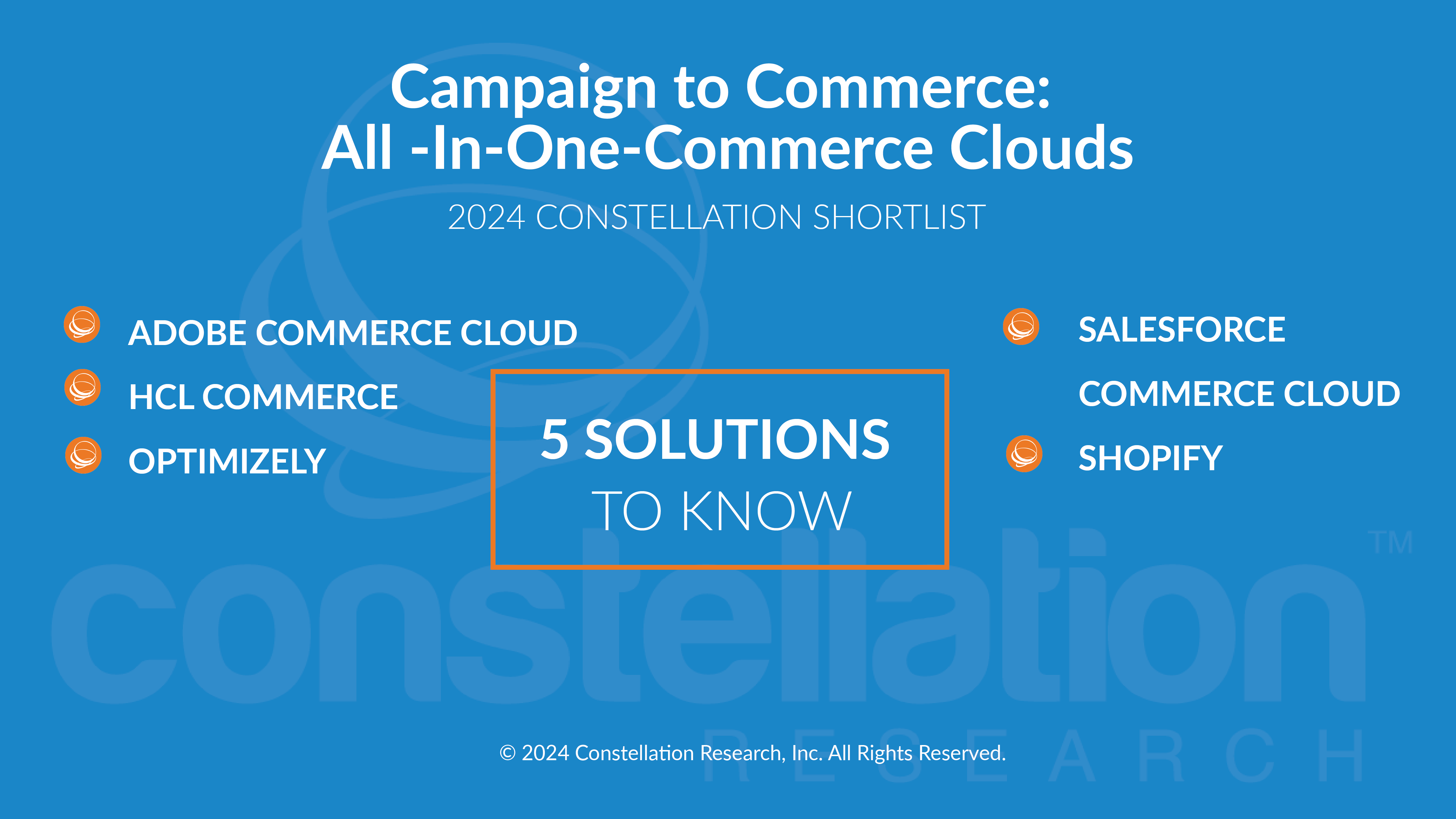 All-in-one commerce solutions deliver a full stack of technologies required to deliver end-to-end commerce for both the business-to-business (B2B) and business-to-consumer (B2C) markets. Constellation estimates the market for Matrix Commerce solutions will reach $17.8 billion by 2030.